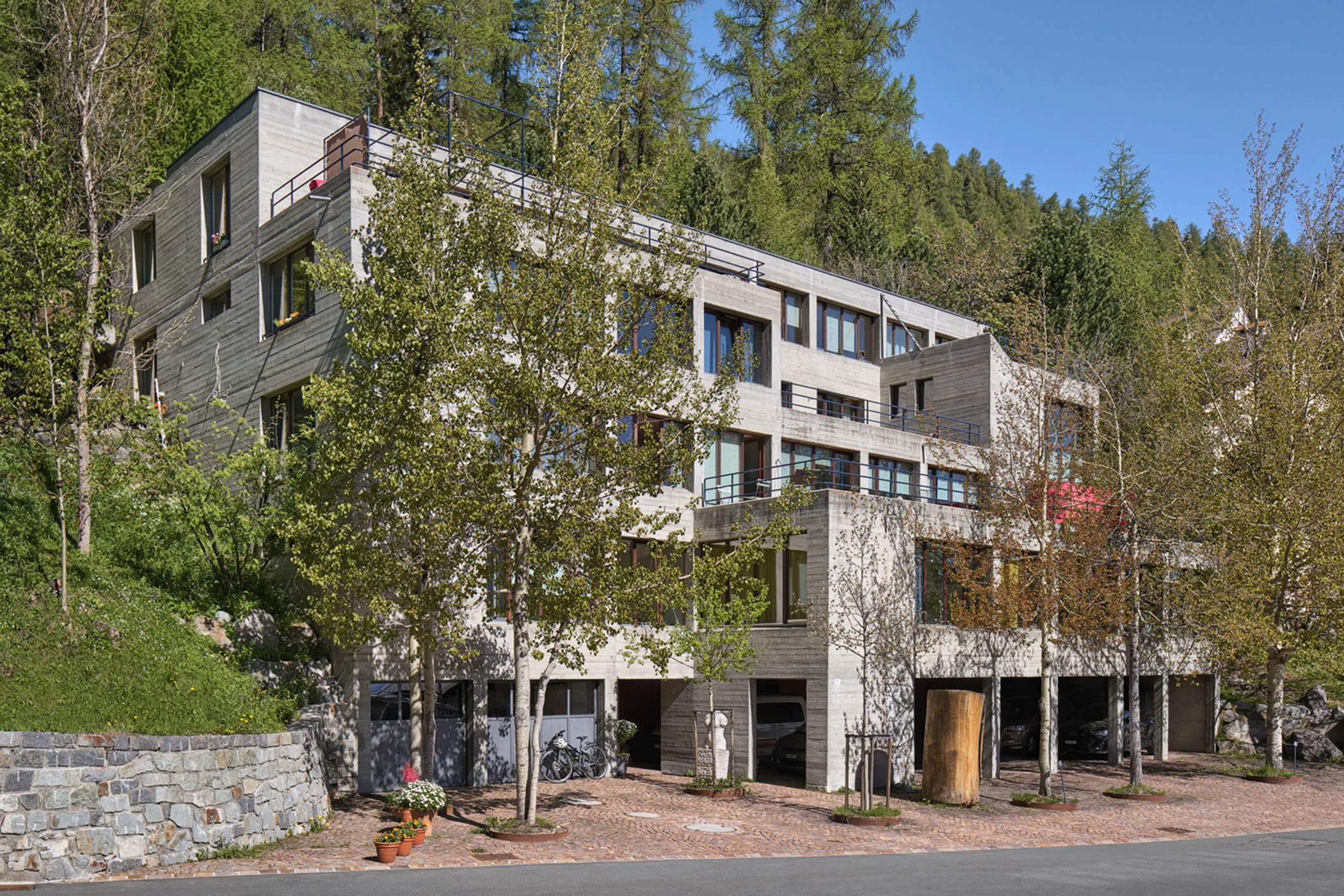 Vor den Hang gestellt, erhebt sich der wohlproportionierte, scharfkantige Kubus mit seiner puristischen Betonästhetik fünfgeschossig über einem rechtwinkligen Grundriss. Die Abstufung belebt und bricht das Blockhafte des mächtigen Gebäudes, das neben dem zweistöckigen Atelier mit zugeordneter Maisonette acht Mietwohnungen unterschiedlicher Grösse umfasst. Der auf dem Gedanken einer Wohn- und Arbeitsgemeinschaft von Architekten basierende Bau ist mit seiner flexiblen inneren Struktur auch typologisch interessant: ein Haus der Durchlässigkeit und des Ineinandergreifens von Wohnen und Arbeiten. Ein Haus, das die soziale Umbruchstimmung der Zeit reflektiert.