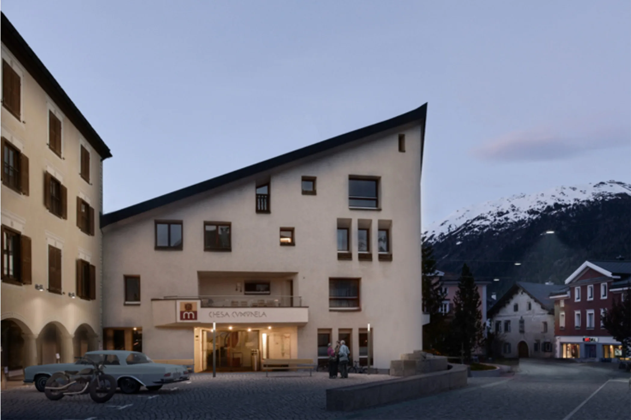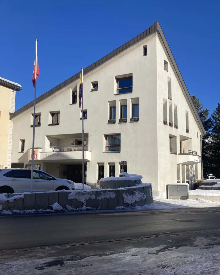 Das Gebäude von Robert Obrist beinhaltet neben vier Wohnungen auch Büroräume für eine Arztpraxis, das Forstamt und die Gemeindeverwaltung. Der Architekt hat dem Gebäude eine charakteristische vertikale Kante gegeben, die sich bei verschiedenen weiteren Gebäuden von Robert Obrist wiederfindet. So z. B. beim Kindergarten in La Punt-Chamuesch oder auch beim Gebäude des Segelclubs St. Moritz.