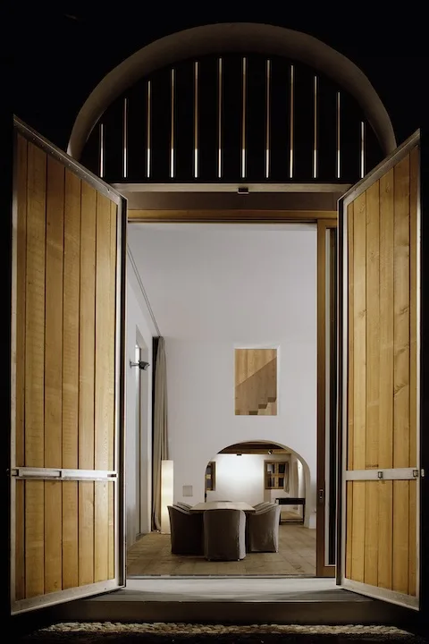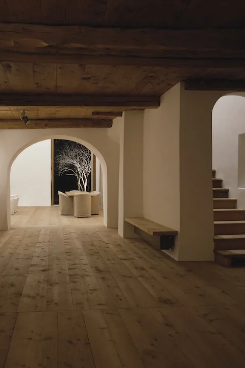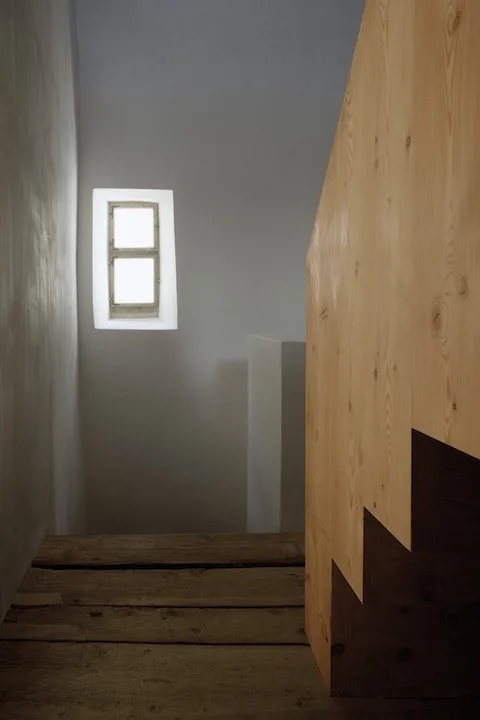 Die meisten neueren An- und Einbauten entfernten wir. Dieser Rückbau auf die historische Substanz brachte die ursprünglichen grosszügigen Raumsequenzen zum Vorschein. Den verbleibenden Teil des ursprünglichen Ökonomietrakts füllten wir aus mit einem von der Fassade zurückversetzten und von der alten Konstruktion unabhängigen Einbau, der als Wohnraum dient. Die originalen Rundbogenöffnungen der Stallscheune füllten wir mit Holzlamellen, die verschieden schräg gestellt werden können, um den Grad der Öffnung und den Lichteinfall zu dosieren. (Ruch&Partner Architekten)
