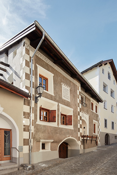 Während die denkmalgeschützte, strassenseitige Front mit der sgraffitoverzierten Fassade und den originalen Holzstuben ihren historischen Charme bewahrte, profitierte der rückseitige Teil im Zuge der Sanierung von einer gezielt eingesetzten Neubauarchitektur, die ihrerseits der Tradition mit grösstem Respekt begegnet und in zahlreichen Details würdigt.
