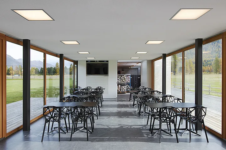 Der Fussballplatz liegt direkt neben dem felsigen Hügel San Gian und in Sichtweite der romanischen Kirche mit seiner Friedhofsmauer. Das Gebäude sollte ein einfacher Kubus werden, welches sich dem Felsen, der Kirche und dem Hügel unterordnet. Die Farbgebung sollte sich der Kirche und Friedhofsmauer anpassen. Das Dach wurde zu einer Negativform ausgebildet, somit konnten die Solarkollektoren unsichtbar in der Dachlandschaft integriert werden. Das geschlossene Volumen wird durch zwei grosse Öffnungen in Längsrichtung unterbrochen und erlauben somit einen Querdurchblick des Gebäudes. Um in den Fassaden keine weiteren grossen Öffnungen anbringen zu müssen, wurden Oblichter eingebaut. Im Erdgeschoss entstanden Restaurant, Küche, Speaker-Kabine und ein grosser, multifunktioneller Raum. Das Untergeschoss wird durch zwei Treppen und einen Längskorridor erschlossen. Dort befinden sich Garderoben, Duschen, Toilettenanlagen, Schiedsrichterraum sowie Technikräume. Die Duschen wurden mit Mosaikwänden versehen, welche sich farblich an den Deckenmalereien im Innern der Kirche San Gian orientieren. Mit Hilfe von Pixeln wurde ein neues Bild mit diesen Farben generiert. Ansonsten wurde das Innere des Gebäudes in schwarz und weiss gestaltet, nach dem Logo des Fussballclubs Celerina.
