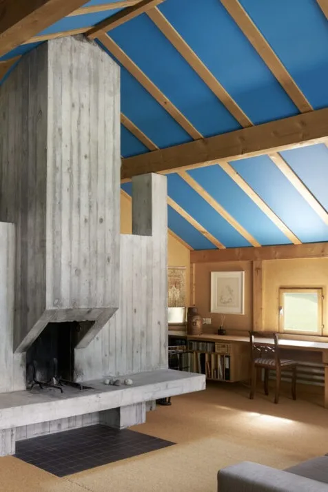 Um den Kern herum ist ein quadratischer Holzständerbau organisiert, dessen 1-Meter-Raster die innere Ordnung bestimmt. Die Ausfachung aus Holzwerkstoffplatten bleibt sichtbar, während aussen eine verputzte Schale aus Bausteinen die Konstruktion umhüllt.