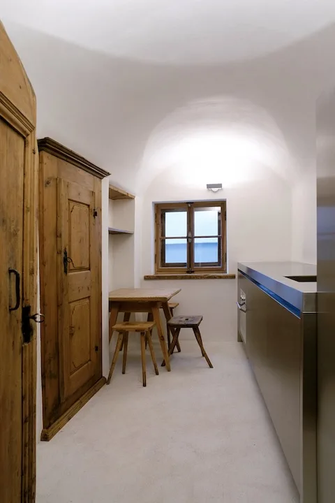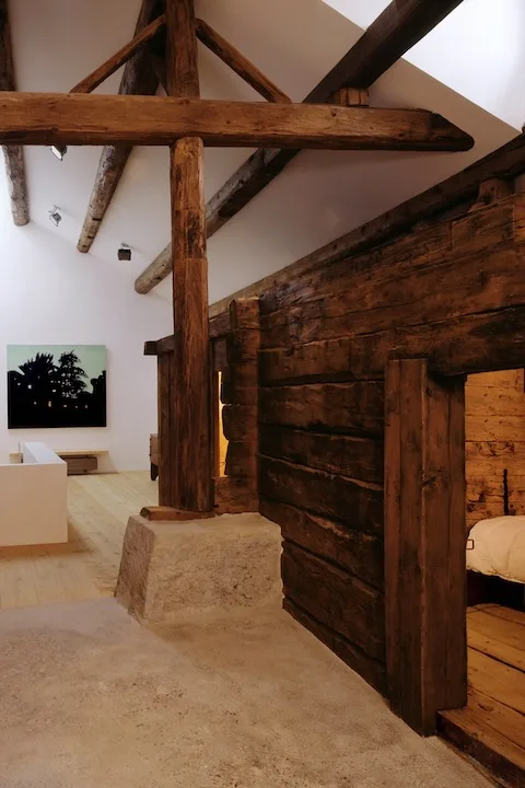 Die ehemaligen Ställe im Untergeschoss sowie der ehemalige Heustall dienen heute als Ausstellungsräume, die Stube ist das Büro der Galeristin;  Küche und Esszimmer sind da, wo sie ursprünglich waren. Im Obergeschoss hat es drei Schlafkammern aus Holz innerhalb eines sehr hohen Raumes, der bis zum Dach geht.