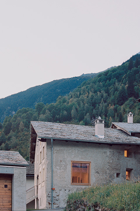 Montaccio liegt westlich von Stampa an einem sonnigen Südhang mit Blick auf Italien. Das Wohnhaus befindet sich am Dorfrand, unmittelbar an der Zufahrtsstrasse, die von Stampa ins Dorfzentrum führt. Das Gebäudevolumen, bestehend aus zwei Gebäudeteilen, nimmt eine markante Stellung im historischen Dorfbild ein und prägt mit seiner Präsenz die Silhouette des Dorfrands. Das ursprüngliche Wohnhaus, datiert auf das Jahr 1719, befand sich in einem stark sanierungsbedürftigen Zustand. Daher war das Ziel nicht die maximale Erhaltung der historischen Substanz, sondern die gezielte Nutzung und Integration der noch intakten Bestandteile, ergänzt durch neue Elemente. Alt und Neu wurden nicht als Gegensatz inszeniert, sondern als harmonisches Miteinander – eine Haltung, die die Bauweise im Bergell seit Jahrhunderten prägt.