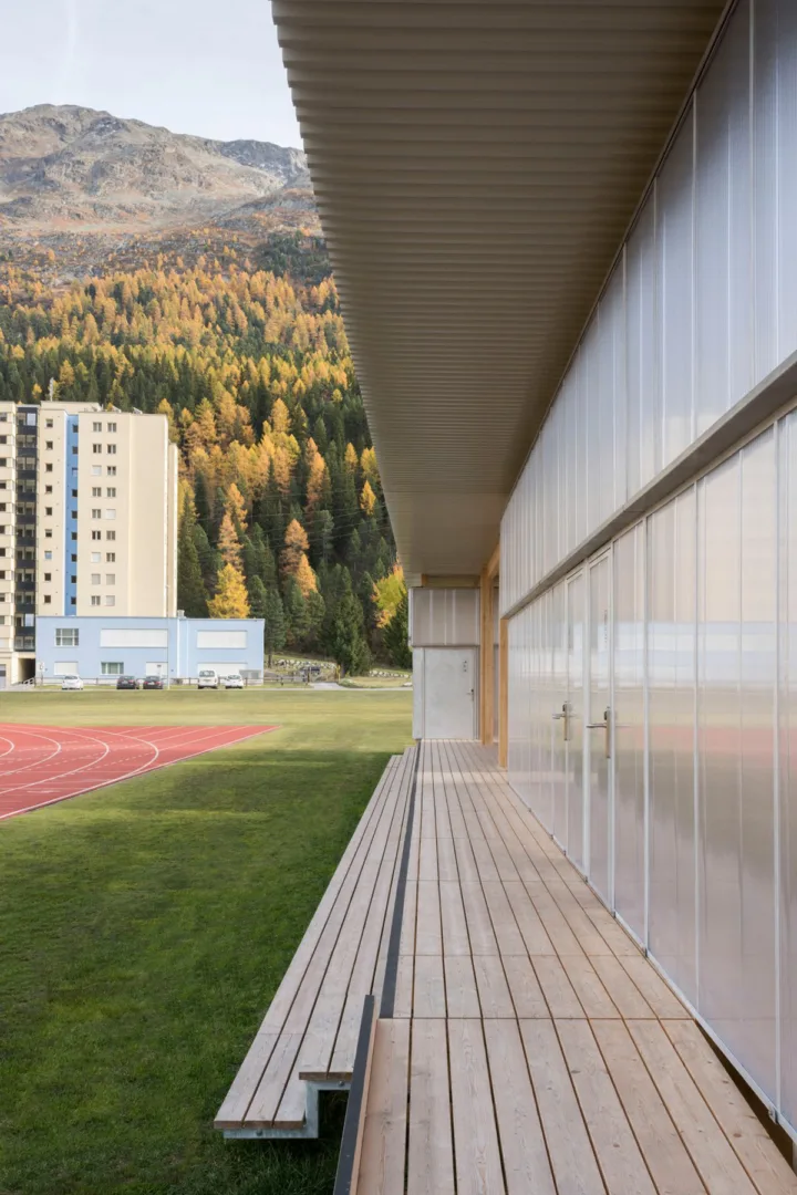 Für das Höhentrainings- und Wettkampfzentrums St. Moritz (HTWZ) entwarfen Krähnenbühl Architekten mit dem Bauingenieurbüro Walter Bieler AG zwei neue Bauten – ein Lagergebäude und ein Garderobenpavillon. Die Grösse und Form des Lagergebäudes wurde massgebend durch die einzulagernden Elemente des mobilen, temporären Garderobenpavillons bestimmt, welcher für die Sommermonate neben der Tartanbahn aufgestellt wird. Der Pavillon zeichnet sich durch seine Leichtigkeit und Filigranität aus. Die Holzkonstruktion mit deren Verbindungen sowie die Dimensionierung der Bauteile sind so konzipiert, dass sie einen leichten Auf- und Abbau sowie deren Lagerung in den Wintermonaten ermöglichen. Das Lagergebäude positioniert sich parallel zur St. Borromäus Kirche und formuliert den Übergang vom Vor- bzw. Parkplatz der Kirche zum Sportgelände. Als dauerhaftes Element der Sportanlage sitzt das Gebäude auf einem massiven Sockel und ist mit einer Lärchenschindeln-Verkleidung versehen.