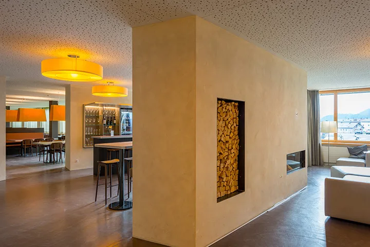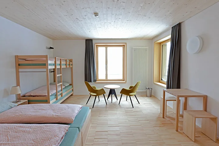 Sumpfkalkputz an den Wänden, Massivholz an Böden und Decken, an Fenstern und Fensterleibungen, sowie beim eigens für die Jugendherberge St. Moritz entwickelten Mobliars in massiver Esche prägen den Innenausbau und die Ausstattung des neuen Zimmertraktes im 4. Obergeschoss. Der Haupteingang, das Foyer mit Frontoffice und die Aufenthaltsbereiche für die Gäste im Erdgeschoss wurden räumlich neu gegliedert und gestalterisch angepasst.