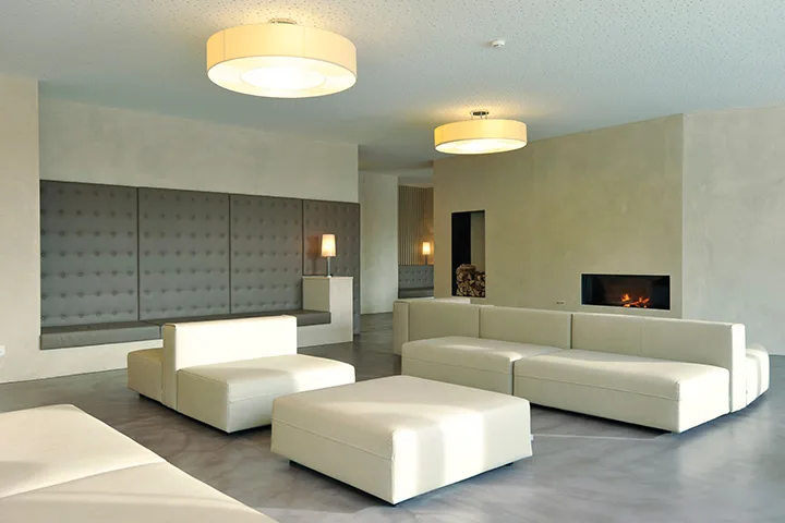 Das Foyer und die Aufenthaltsbereiche im Erdgeschoss werden räumlich neu zusammengefasst. Von der Ortogonalen abweichende Raumkörper gliedern den Gesamtraum in unterschiedliche Raumzonen. Diagonale Sichtbeziehungen zwischen den einzelnen Aufenthaltsbereichen schaffen Transparenz und Übersichtlichkeit. Sitznischen- und bänke laden zum Verweilen ein. Materialien und Oberflächenfarben schaffen zusammen mit der dezenten Beleuchtung ein stimmungsvolles Ambiente.