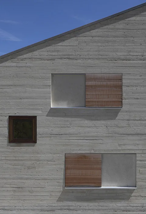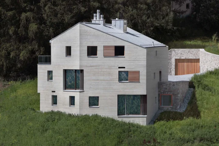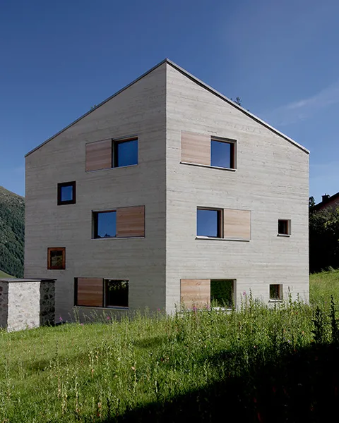 Das Projekt Crusch war hinsichtlich seiner dispersen Umgebung eine besondere Herausforderung. Hangaufwärts wird die Parzelle durch ein Wohnquartier begrenzt, welches vorwiegend durch imitative alpine Architektur geprägt wird. Der Entwurfsgedanke bestand darin, die Baukörper so zueinanderzusetzen, dass ein starkes Ensemble entsteht. Das Resultat sind drei polygonale Kuben, die wie Felsen aus der Landschaft ragen. Für die Fassaden wurde weisslich eingefärbter Beton verwendet, der je nach Wetter und Jahreszeit seine farbliche Wirkung leicht ändert. Diese Wirkung entstand durch Beimischung von Weisszement und wurde mittels grosser Muster an Ort und Stelle auf ihre Wirkung überprüft. Für die Betonschalung wurden rohe Lärchenbretter benutzt; gleiche Lärchenbretter wurden auch bei der Herstellung der Fensterschiebeläden verwendet, was ein faszinierendes Spiel zwischen natürlichem Holz und «gegossenem» Holz entstehen lässt.