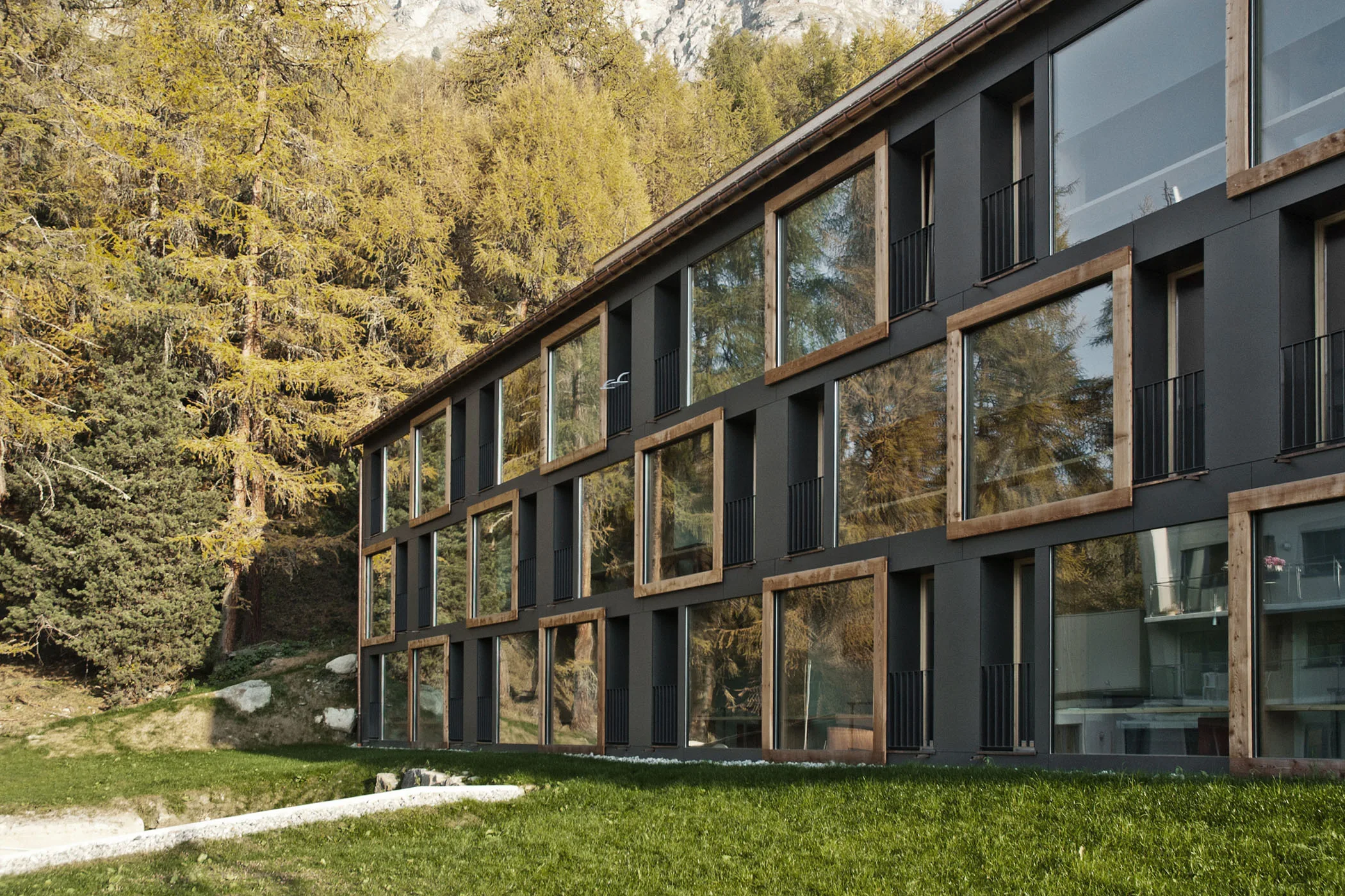 Das Gebäude liegt in der Gefahrenzone II und musste deshalb einen speziellen Lawinenschutz erhalten. Dieser wurde auf der südseitigen Gebäudefassade in Form von Prallschutzgläsern, wovon jedes einzelne 300 kg/m2 Schneelast standhalten muss, angebracht und gestalterisch in das Gebäudekonzept integriert.