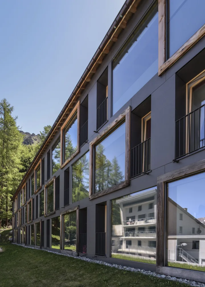 Das Personalhaus der Corvatsch Bahn in Surlej befindet sich in unmittelbarer Nähe von der Talstation des Bergbahnbetriebes. Die in Holz und Eternit gehaltene Fassade wird durch eine klare kubische Formsprache strukturiert. Besonderes Interesse erweckt die Heizung des Gebäudes, denn geheizt wird mithilfe der Abwärme der Motoren der Bergbahn. Diese ökologische Ausrichtung des Baus wird durch eine hochgedämmte Fassade unterstrichen.