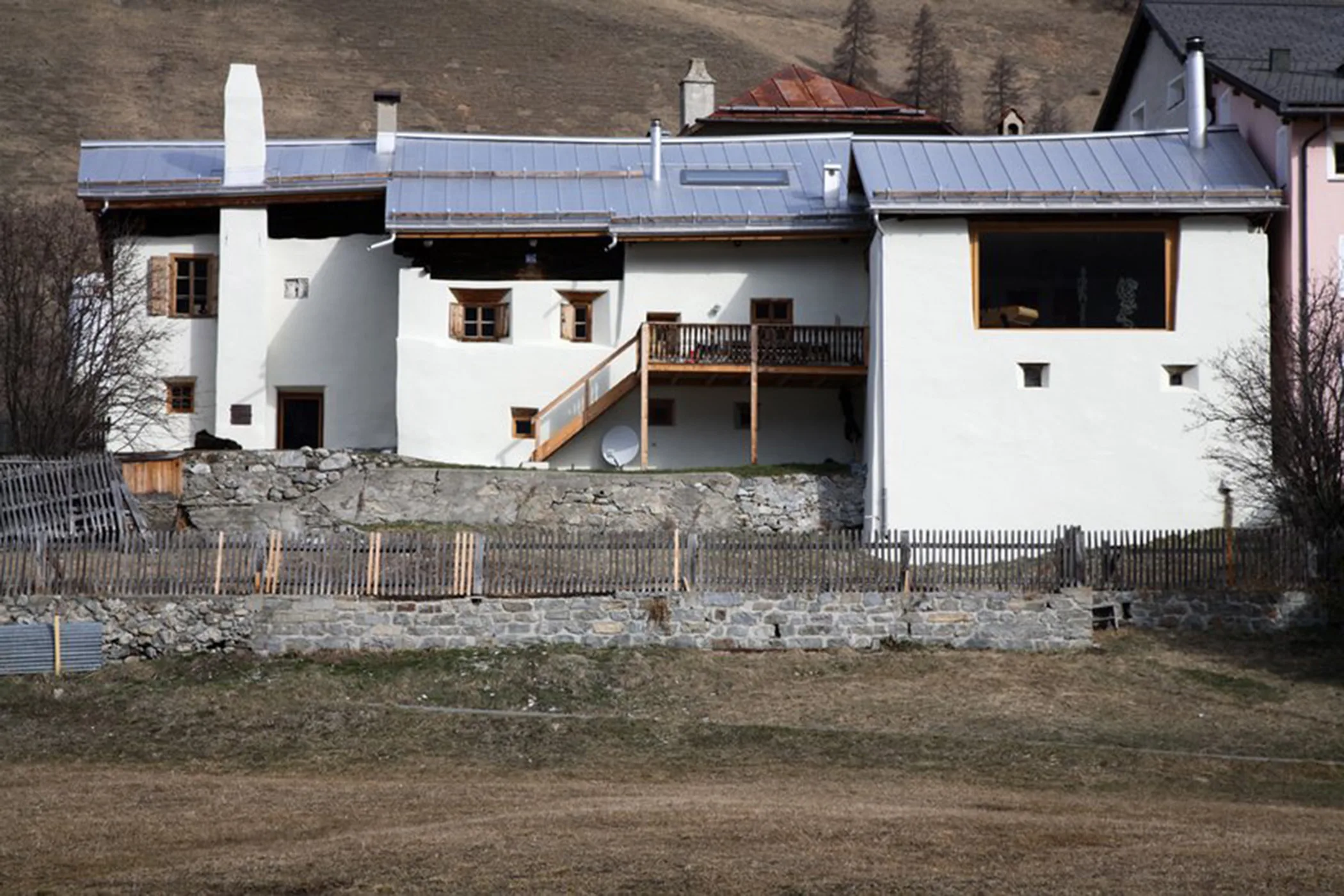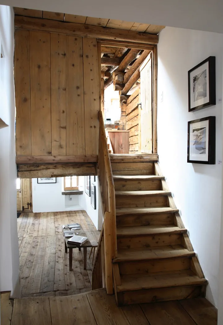 Das ehemalige Engadinerhaus wurde um die Jahrhundertwende des 20. Jahrhunderts in eine Bäckerei umgebaut. Der Stall wurde weiterhin genutzt. Dieses in Teilen aus dem frühen 14. Jahrhundert stammende Kleinod wurde unter der Regie des Architekturbüros in seinem bodenständigen Charakter wie auch in seiner traditionellen Architektur bewahrt. Von der Galerie führt der Weg über eine im späten 19. Jahrhundert eingebaute Arvenholz-Stube, die heutige Bibliothek bis unter das Dach, wo man auf eine Wohnlandschaft trifft: Bohlen, Bretter und Balken definieren abgegrenzte Zonen unterschiedlichster Entstehungszeiträume, schaffen spannende Raumabfolgen und liefern den rauen Hintergrund für den Schlafbereich, der auf einer Empore untergebracht ist. Die daran angrenzende ehemalige Knechtkammer aus dem 19. Jahrhundert ist zum Einbau des Badezimmers genutzt worden, wobei die historischen Böden, Wände und Decken einschliesslich ihrer Oberflächen komplett erhalten blieben. Unter Beibehaltung der Fassadengestalt auf der Süd- und Westseite wurden die Blockbohlen-Ausfachungen herausgenommen und die Öffnungen verglast.