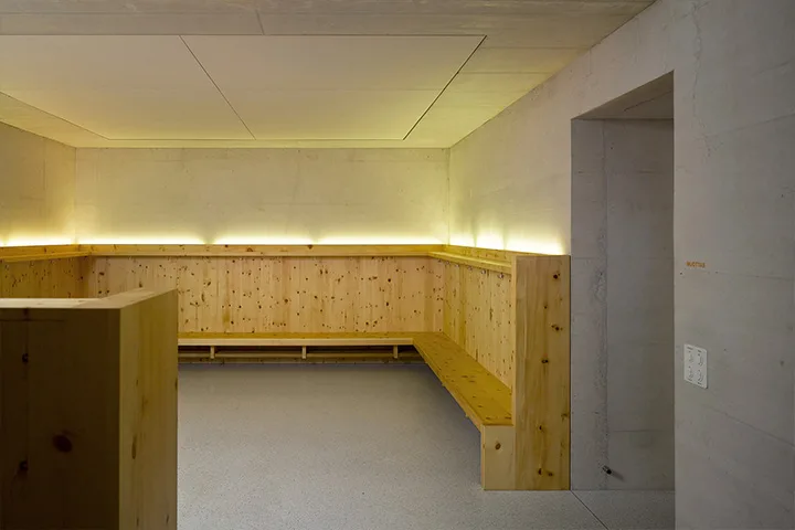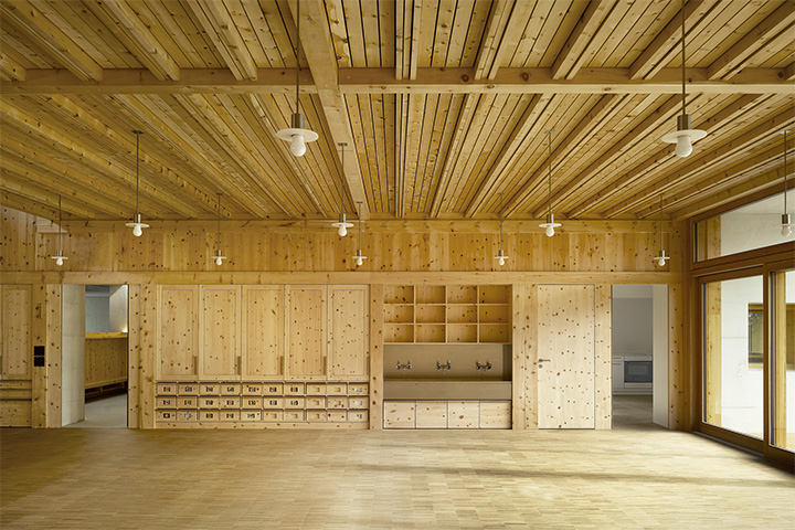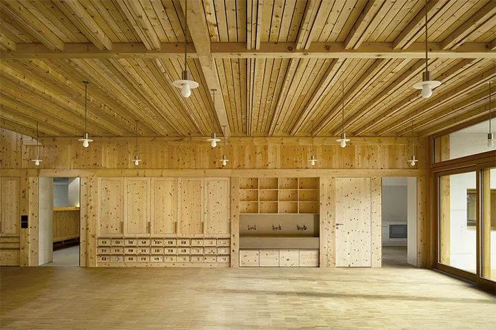 Wie die Wohnstuben der alten Engadiner Häuser sind die drei Kindergarten-Haupträume mit einem unbehandelten Täfer aus Arvenholz aus Unterengadiner Bergwäldern in neu interpretierter Form ausgekleidet. Ein angenehmer Duft von Arvenholz liegt in der Luft.