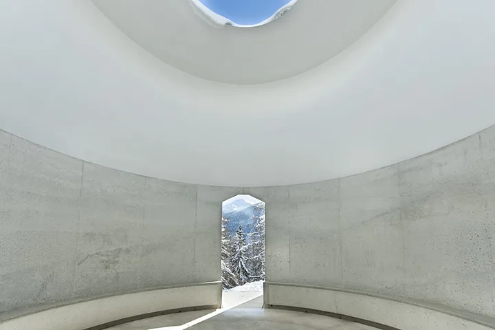 Piz Uter wurde auf Initiative der Bechtler Stiftung in der Nähe zum Hotel Castell in Zuoz errichtet. Der schlichte Rundbau ist ein Ort der Ruhe und der intensiven Begegnung mit der Natur und dem Licht. Der Werktypus des «Skyspace» fokussiert das Zusammentreffen von architektonischem Innen- und natürlichem Aussenraum, indem der Himmel in die Deckenöffnung «geholt» wird. Prinzipiell geht es dem Künstler auch bei dem Skyspace Piz Uter um «Structural Cuts», deren Öffnungen vollständig über der Horizontlinie liegen und die durch Decke und Dach eingeschnitten werden. Die eindrucksvolle Veränderung des Himmels und seiner Farben wird während des Überganges von Tag zu Nacht erfahren. James Turrell widmet sein gesamtes künstlerisches Schaffen der Auseinandersetzung mit den Phänomenen des natürlichen und künstlichen Lichts. Installationen und Environements machen Licht als Medium erfahrbar, Räume sind nicht im herkömmlichen Sinne beleuchtet, sie sind vielmehr von Licht und Farbigkeit erfüllt. Die Faszination und Zeitlosigkeit von James Turrells Arbeiten beruht vor allem darauf, dass es ihm gelingt, Licht als eine Form der Realität unmittelbar sinnlich erfahrbar zu machen.