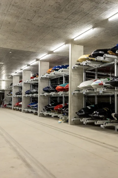 Sowohl Parkplätze für Fahrzeuge und als auch Abstellplätze für Bob waren im beschränkten Start-Areal stets ein Problem, so dass einerseits 2004 die erste Tiefgarage mit 12 gedeckten und 18 oberirdischen Parkplätzen sowie 2007 die Erweiterung der Tiefgarage um 12 und 24 Dach-Parkplätzen realisiert werden konnte. (Ing. Toscano / D. Menghini)