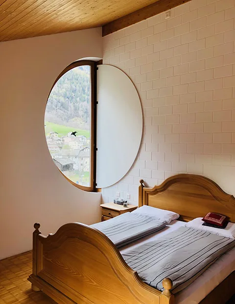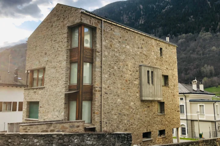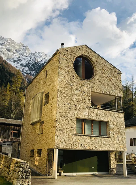 Das Gebäude in Vicosoprano wurde im Jahr 2000 von Romano und Cristina Giovanoli als Einfamilienhaus in Auftrag gegeben. Die Immobilie wurde vom bekannten Bergeller Architekten Renato Maurizio entworfen und gebaut. Das Markenzeichen des Gebäudekonstrukteurs wurde bei diesem Haus markant umgesetzt: das Rundfenster im 4. Stock ist grösser als dasjenige der katholischen Kirche im gleichnamigen Dorf. Weiter verfügt das Einfamilienhaus eine imposante Aussenfassade, welche mit händisch gesammelten Wiesensteinen gemauert wurde. Da sich die Immobilie ausserhalb des Dorfkerns von Vicosoprano befindet, konnte auf eine etwas unorthodoxe Dachkonstruktion ausgewichen werden, welche entgegen der Tradition nicht aus Stein, sondern aus Blech besteht und dem Haus dadurch eine weitere individuelle Note verleiht. Die Innenräume sind aufgrund der Ausrichtung besonders lichtdurchflutet.