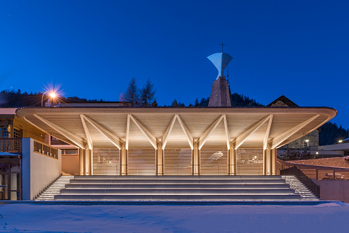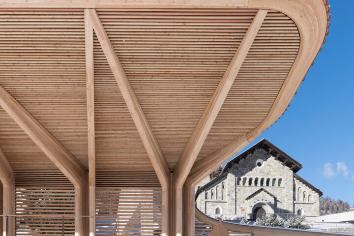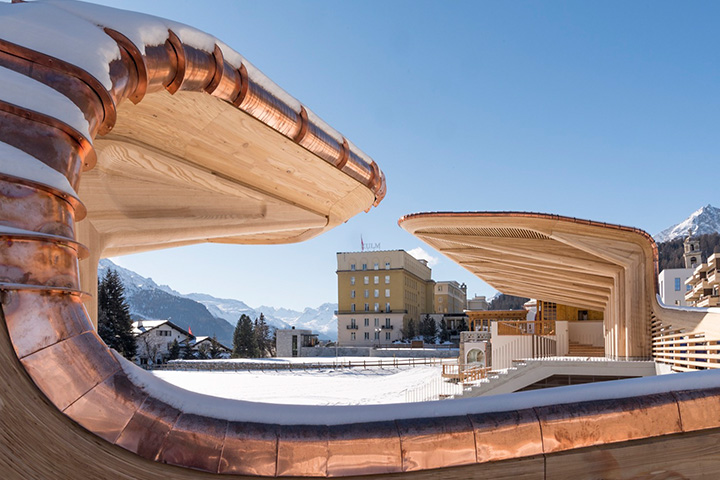 Pritzker-Preisträger Sir Norman Foster entwarf ein neues Ensemble beim Kulm Park. Neben der Renovation des Eispavillons konzipierte er zwei neue Tribünen für kulturelle und sportliche Veranstaltungen für Sommer und Winter. Norman Foster Architects und Küchel Architects ergänzten den alten Eispavillon in St. Moritz durch zwei dynamisch geschwungene Zuschauertribünen. Mittels 3-D-Holzbearbeitungs-Techniken entstand eine architektonisch anspruchsvolle Free-Flow-Form. Die Treppe der Zuschauertribüne, die an den Altbau grenzt und über einige weitere gegenläufige Stufen auf die Pavillon-Terrasse führt, verzahnen Alt- und Neubau miteinander. An dieser obersten Stelle kommen die Dächer der beiden Bauten eng zusammen. Der filigrane Pavillonbau mit den feinen Fensterdetails und dem mehrfach gegliederten Dachabschluss steht dem elegant wie aus einem Guss wirkenden geschwungenen Tribünendach gegenüber.