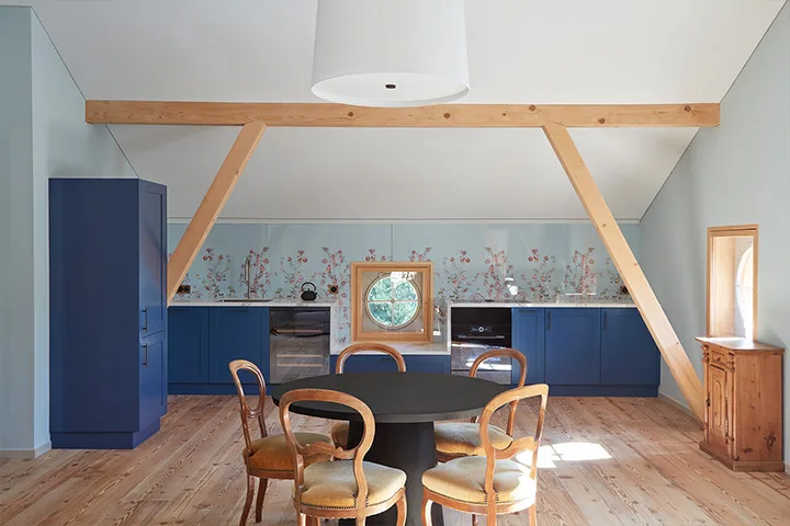 Die Geschichte der Familie Klainguti, eine der angesehenen alten Patrizierfamilien von Pontresina, ist untrennbar mit der Villa verbunden. Obwohl dem stattlichen Gebäude von aussen ein leicht unnahbarer Charakter anhaftet, war es letztlich das geliebte Zuhause einer Familie. Eltern, Kindern und Enkelkinder wuchsen in ihm auf, und auch der Bauherr hatte hier das Licht der Welt erblickt. So waren es vor allem die Spuren eines familiären Miteinanders, die den Umbau zu einer fesselnden Entdeckungsreise machten: Das vertraute «Wandmassband» im Obergeschoss, zum Beispiel, wie es Eltern weltweit an Wänden oder Türrahmen anbringen, um stolz das Wachstum ihrer Kinder zu verfolgen. Antike Tapeten hängen wie Zeitzeugen an den Wänden, während eine kostbare japanische Vase auf die fernen Länder verweist, die von der Familie bereist wurde. Diese Details sind nicht nur Relikte vergangener Tage, sondern erzählen persönliche Geschichten aus dem Leben.